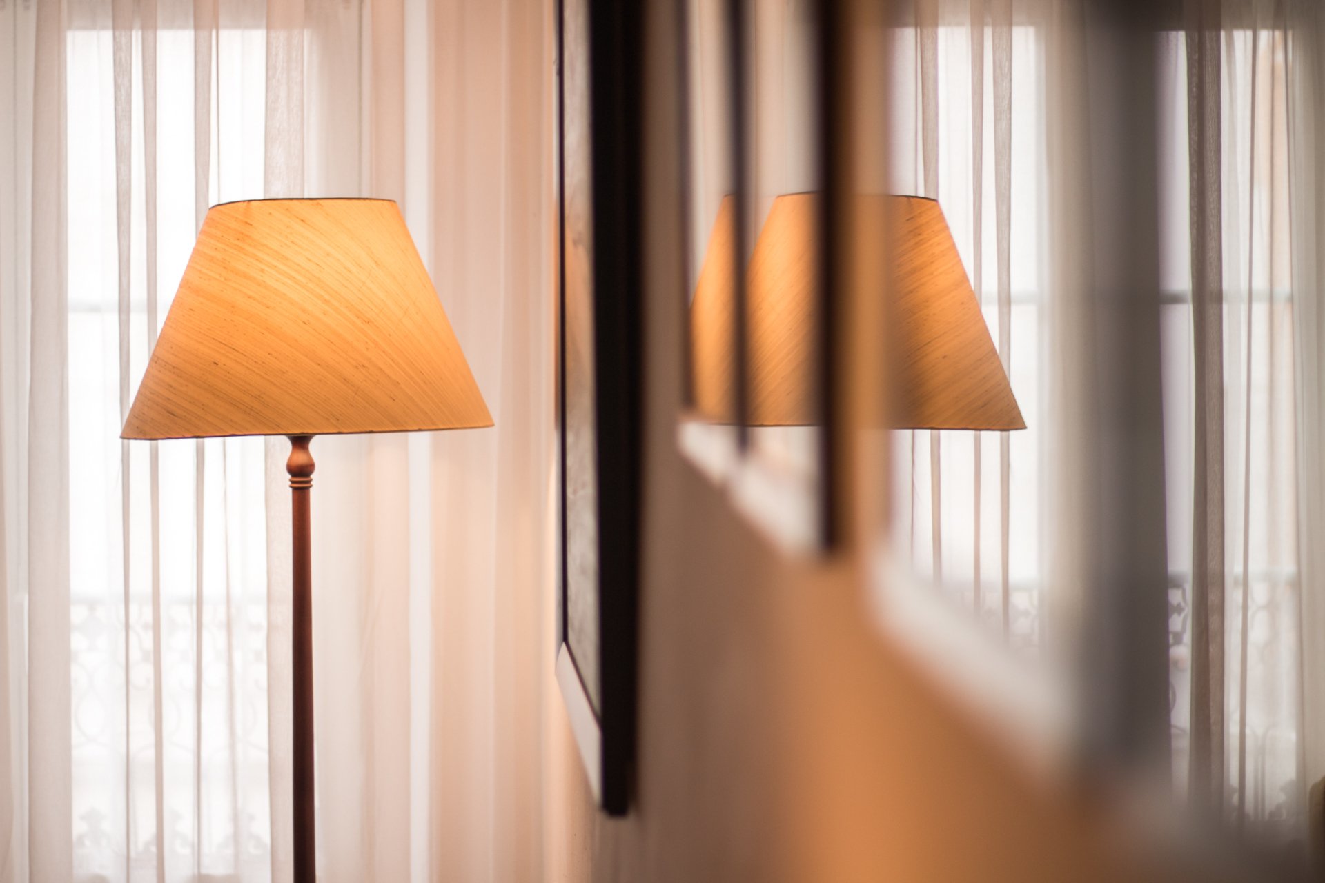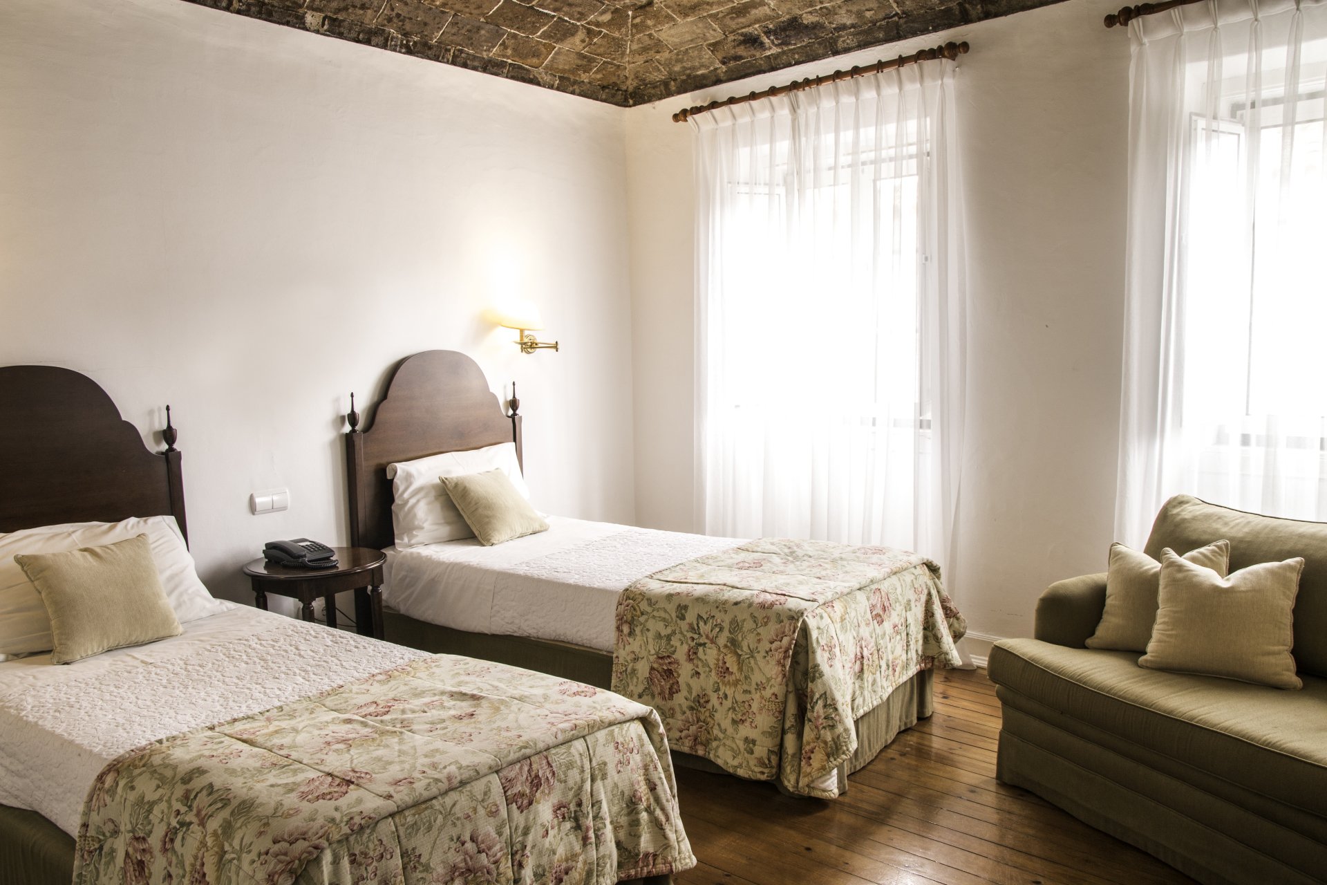 Room with 2 twin beds, bathed in natural light, wooden floors.